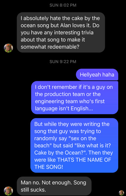 "Universe" by Official HIGE DANism : Spotify J-Pop 新幹線 January 15, 2021 | "Your Closet" by 80KIDZ : Spotify Discover Weekly February 1, 2021 | "One More" by SG Lewis : Spotify New Music Friday February 5, 2021 | "Per la Luna: by Bad Snacks : Spotify Discover Weekly December 14, 2020 | "ライディーン" by Yellow Magic Orchestra : Artist explore from Turntable Lab's FB Post December, 9.2020 | "My Mind" by Sherwyn : Spotify Discover Weekly December 7, 2020 | "Cake by the Ocean" by DNCE : FB Message conversation with Jason C | "NY" by Emily Vu : Spotify Discover Weekly November 23, 2020 | "Sagittarius Superstar" by COIN : Spotify Discover Weekly February 15, 2021 | "What Are We Waiting For" by Nicolette Robinson : Spotify Artist Page Explore January 14, 2021 | "Don't You Forget" by Louis York : Spotify Soul Coffee January 13, 2021 | "Daymaker" by Flamingosis : Spotify Discover Weekly January 18, 2021 | "SUPERBLOOM" by MisterWives : Spotify Discover Weekly February 1, 2021 | "Hate You + Love You" by Cheat Codes : Spotify New Music Friday February 5, 2021 | "Break Ups 2 Make Ups" by Method Man : *'Boot Clapping off snow' January 28, 2021 | "Never Gonna Give You Up" by Rick Astley : Unlocking 80's Mix in Battle Pass in CoD | *Did not happen in music video
